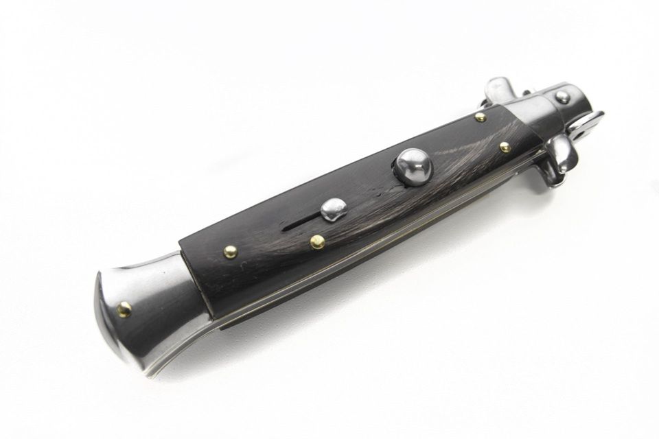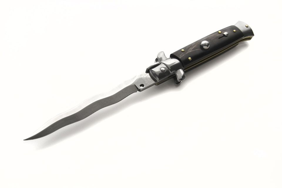 Frank B 9 Inch Italian Stiletto Automatic Knife Dark Horn Kriss. This classic 9" stiletto switchblade made by Frank Beltrame comes with a AISI 420 stainless steel kriss blade. The handle on this automatic stiletto is cow horn. The slide safety is very well made, it has fast opening and stainless steel bolsters release. Overall Length: 23cm - 9" Blade Length: 10cm - 4" Blade thickness: 3mm - 0.12" Weight: 115gr - 4oz Blade material: AISI 420 Stainless Steel Handle material: Cow Horn Made in: Italy