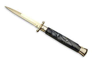 Frank Beltrame 11 Inch Ebony Wood Swinguard Stiletto Automatic Knife Gold Bayo. Overall Length: 28cm - 11" Blade Length: 12cm - 5" Blade thickness: 4mm - 0.14" Weight: 145 gr Blade material: AISI 420 Stainless steel Handle material: Buffalo horn Frame material: Stainless steel Made in: Italy
