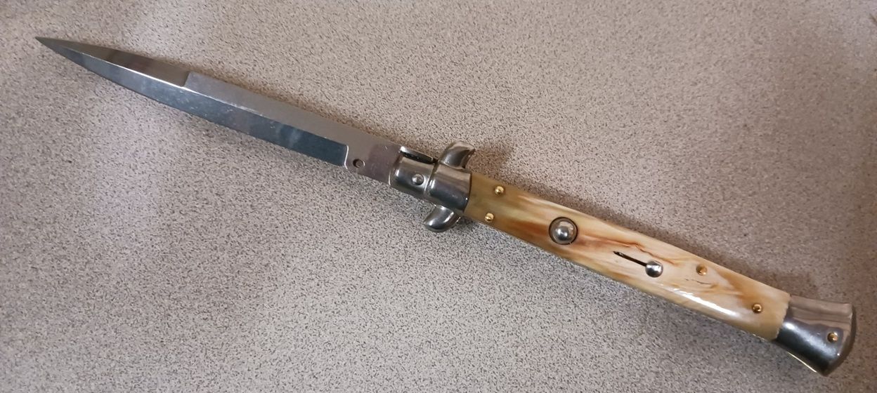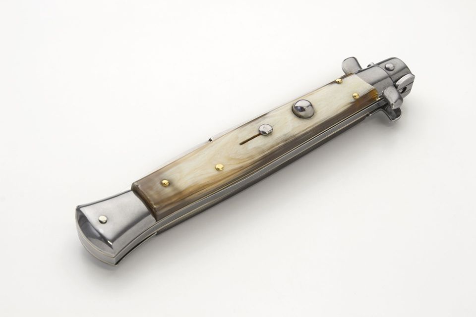 Frank Beltrame 11" Italian Stiletto French Cow Horn Bayonet Automatic Knife. Overall Length: 28cm -11" Blade Length: 12,5cm - 5" Blade thickness: 3mm - 0,12" Weight: 140 gr Blade Material: AISI 420 Stainless steel Handle material: Imitation pearl Frame material: Brass Made in: Italy