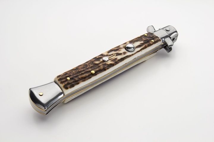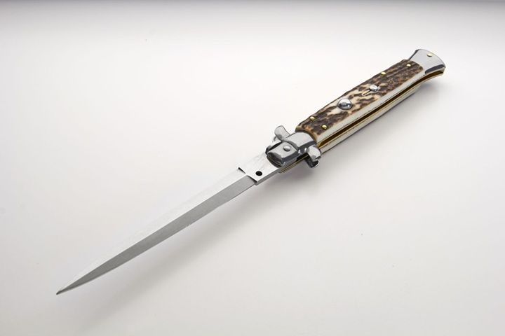Frank Beltrame 11" Italian Stiletto Stag Horn Dagger Automatic Knife. Overall Length: 28cm -11" Blade Length: 12,5cm - 5" Blade thickness: 3mm - 0,12" Weight: 140 gr Blade material: AISI 420 Stainless steel Handle material: Genuine European stag Frame material: Brass Made in: Italy