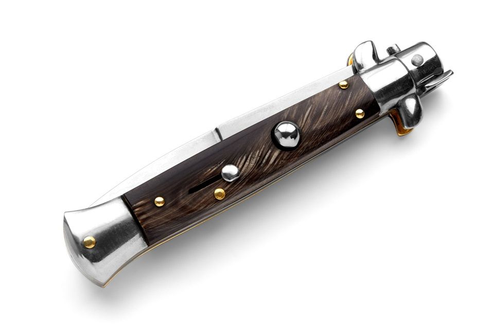 Frank Beltrame 9" Buffalo Horn Picklock Stiletto Automatic Knife Bayonet. A classic 9" stiletto switchblade made by Frank Beltrame. The STILETTO classic. Always sexy, always attractive. This automatic knife is made in Italy by Frank Beltrame. Stainless steel bolsters release. This one wears a Buffalo horn scales on a bayonet blade. Slide safety and very well made. Note: as it is a natural material, color, texture and pattern will vary from knife to knife. Overall Length: 23cm - 9" Blade Length: 10cm - 4" Blade thickness: 4mm - 0.15" Weight: 110 gr Blade material: AISI 420 Stainless steel Handle material: Buffalo horn Frame material: Stainless steel Made in: Italy