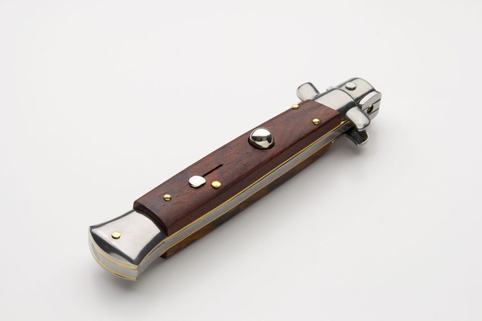 Frank Beltrame 9" Italian Stiletto Automatic Knife Red Heart Wood (4" Satin Dagger). A classic 9" stiletto switchblade made by Frank Beltrame. The STILETTO classic. Always sexy, always attractive. This automatic knife is made in Italy by Frank Beltrame. Stainless steel bolsters release. This one wears a Red Heart wood scales on a dagger blade. Slide safety and very well made. Note: as it is a natural material, color, texture and pattern will vary from knife to knife. Overall Length: 23cm - 9" Blade Length: 10cm - 4" Blade thickness: 3mm - 0.12" Weight: 110 gr Blade material: AISI 420 Stainless steel Handle material: Red Heart wood Frame material: Stainless steel Made in: Italy