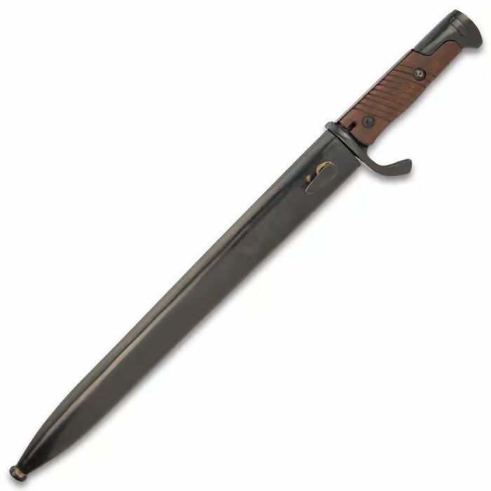 German M98 05 Butcher Sawback Bayonet. When you’re looking for high-quality, accurate militaria reproductions to add to your collection, this is the only place to be. The German M98 05 Butcher Sawback Bayonet was carried by German soldiers during WWI and was notorious for the vicious injury it caused when used. However, the aggressive sawback design was intended as a tool not necessarily as a weapon. Our authentic reproduction has a 14” high carbon iron blade with a toothy sawback and the wooden handle scales are scored. The 19 1/4” overall length bayonet slides securely into an 18-gauge, black metal scabbard. When you’re looking for high-quality, accurate militaria reproductions to add to your collection, this is the only place to be Our authentic reproduction has a 14” high carbon iron blade with a toothy sawback and the wooden handle scales are scored The 19 1/4” overall length bayonet slides securely into an 18-gauge, black metal scabbard