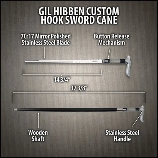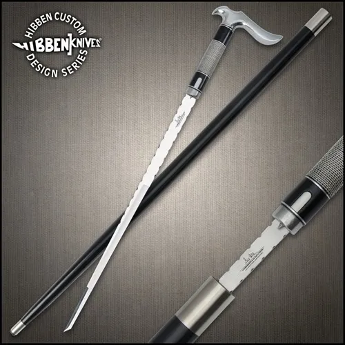 Gil Hibben’s Custom Hook Sword Cane is far more than a walking aid — it’s a striking display of craftsmanship and hidden strength. The gleaming black shaft, built from solid wood with high-polish stainless steel accents, conceals a 14 3/4” mirror-polished tanto blade crafted from 7Cr17 stainless steel. Sleek, balanced, and precise, it’s built to impress at first glance and built to perform when called upon. The stainless steel hook handle is more than just eye-catching — it’s ergonomically shaped for a confident grip and offers practical support when walking or standing. The concealed blade deploys quickly via a smooth, built-in release system, locking back into place with ease. Whether showcased or carried, this is a bold fusion of elegance and edge — unmistakably Hibben. REFINED SHAFT DESIGN: 37 3/8" wood shaft with high-polish stainless steel details. MIRROR-FINISHED BLADE: 14 3/4" 7Cr17 stainless steel tanto blade hidden inside. STRIKING HOOK HANDLE: Sculpted stainless steel for both style and leverage. INTEGRATED LOCKING MECHANISM: Blade snaps into place and releases with ease. SIGNATURE HIBBEN STYLE: A master-level design from one of the most iconic names in blades.