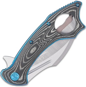 The Hibben Warbird Karambit is so eye-catching yet so completely functional, as you’ve come to expect with a Gil Hibben original The folding karambit has a 3 1/8” 7Cr17 stainless steel, curved blade with a dark grey titanium coating The razor-sharp blade can be easily deployed using the flipper to access the smooth, ball bearing opening system The open-ring handle scales are of dark grey linen Micarta, secured with blue screws to match the metallic blue liners The karambit is 4 3/4”, when closed, 7 1/2” in overall length, and has a blue metallic pocket clip with the Hibben Knives logo The blade covering mechanism allows the karambit to have a blade the full length of the handle without risk of cutting