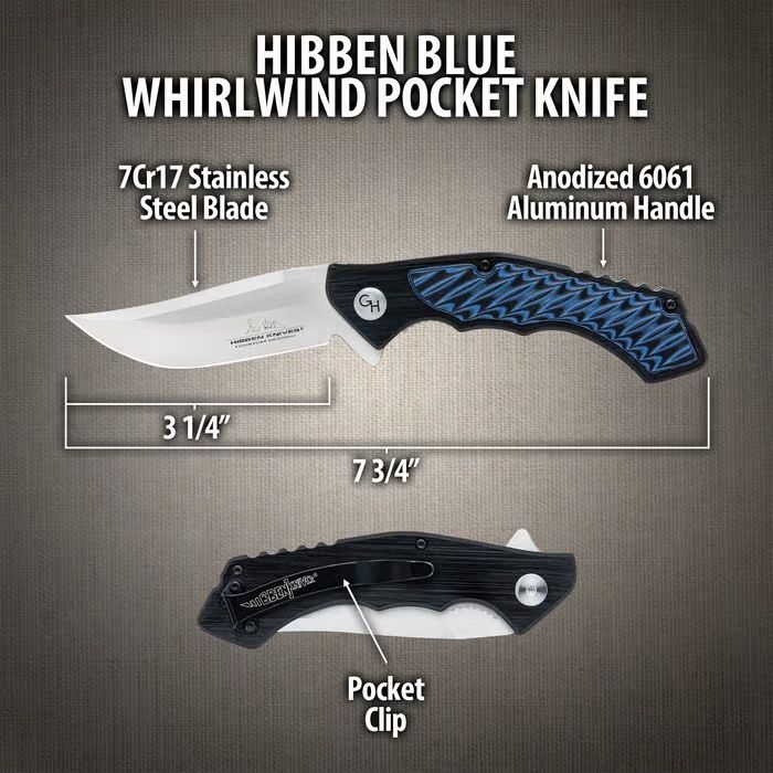 The Hibben Blue Whirlwind Pocket Knife is a striking fusion of craftsmanship and performance, designed by legendary knifemaker Gil Hibben. Its 3 1/2" 7Cr17 stainless steel blade features a sleek, satin finish and delivers clean, efficient cuts for everyday tasks. The ball-bearing pivot system ensures lightning-fast, one-handed deployment, making it a dependable tool you’ll reach for time and again. The handle’s deep blue anodized aluminum scales give the knife a bold appearance, while maintaining lightweight handling and durability. Textured for grip and equipped with a secure liner lock, the ergonomic design ensures control and comfort with every use. Whether you're tackling chores, outdoor projects, or daily carry needs, the Whirlwind brings precision and style to your gear. SHARP PERFORMANCE BLADE: 3 1/2" 7Cr17 stainless steel blade provides clean slicing and long-lasting edge retention. FAST DEPLOYMENT: Ball-bearing opening system allows for quick, one-handed blade access. DURABLE ALUMINUM HANDLE: Blue anodized scales offer lightweight strength and a sleek, modern look. ERGONOMIC CONTROL: Textured grip and liner lock deliver a safe, non-slip hold during use. HIBBEN-DESIGNED: Designed by master bladesmith Gil Hibben, blending function and bold aesthetics.