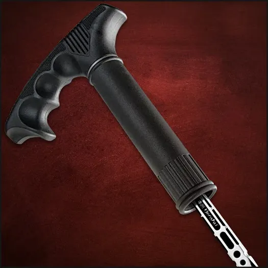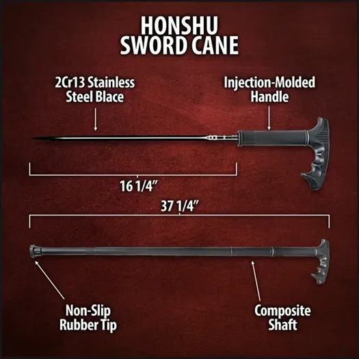 Honshu Sword Cane Walking Stick. The Honshu Sword Cane combines discreet elegance with practical functionality. Its 16 1/4" 2Cr13 stainless steel blade stays concealed within a tough composite shaft, offering a sleek yet formidable design. The fiberglass-reinforced nylon handle provides a secure grip, while the no-slip rubber tip ensures stability on various surfaces. Whether for everyday use or as a unique addition to your collection, this cane blends refinement with a subtle tactical edge. Built for durability, the reinforced composite shaft withstands daily wear, making it both a reliable walking aid and a discreet self-defense option. The Honshu Sword Cane is the perfect balance of sophistication and strength, offering a functional design that remains unassuming yet highly capable. DISCREET PROTECTION: 16 1/4" 2Cr13 stainless steel blade remains hidden within the durable cane. REINFORCED SHAFT: Tough composite construction ensures long-lasting strength. SECURE GRIP: Fiberglass-reinforced nylon handle provides comfort and control. STABLE SUPPORT: No-slip rubber tip enhances traction on various surfaces. TACTICAL ELEGANCE: A refined yet capable design for everyday use or collection.