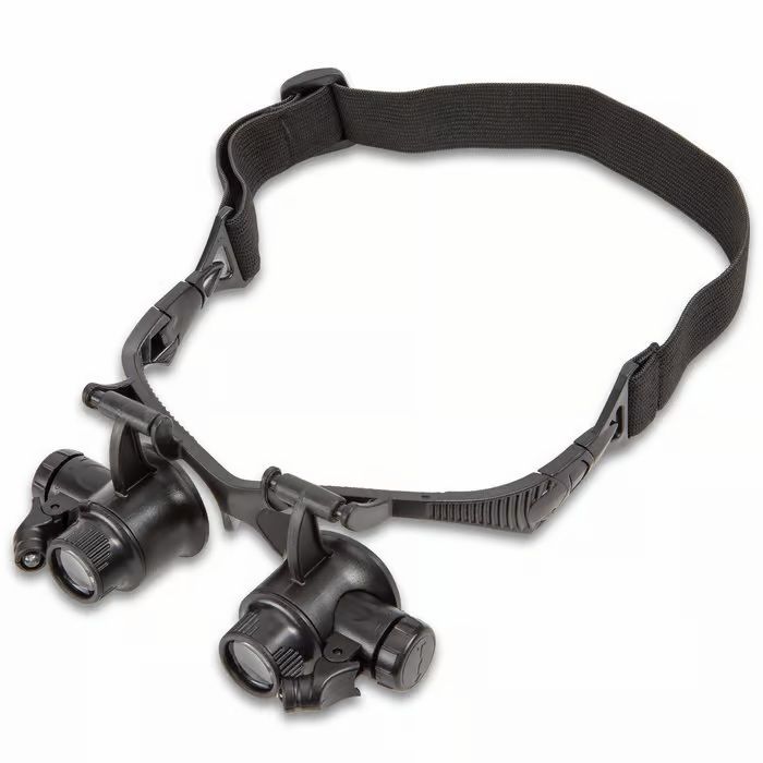 The Illuminated Hands-Free Dual Loupe has unlimited uses for your home or office, your hobbies and for finely detailed work. Mounted on a plastic glasses frame, the loupe easily pivots and slides and has a comfortable, swappable elastic band. A super bright white LED light ensures that you have a fully-illuminated view of whatever you’re looking at or working on. Two sets of four interchangeable acrylic lenses offer magnifications of 10x, 15x, 20x and 25x. Three AG10 batteries (included) are required for each loupe and a plastic storage case is included for the loupes. This hands-free dual loupe has unlimited uses for your home or office, your hobbies and for finely detailed work Mounted on a plastic glasses frame, the loupe easily pivots and slides and has a comfortable, swappable elastic band A super bright white LED light ensures that you have a fully-illuminated view of whatever you’re looking at or working on Two sets of four interchangeable acrylic lenses offer magnifications of 10x, 15x, 20x and 25x Three AG10 batteries (included) are required for each loupe and a plastic storage case is included for the loupes