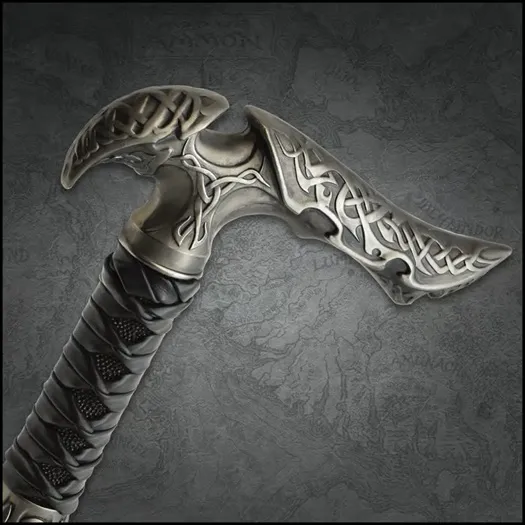 The Kit Rae Black Axios Sword Cane is a striking fusion of fantasy artistry and meticulous craftsmanship, designed by legendary weapon creator Kit Rae. This elegant yet bold piece features a 23-inch 1045 carbon steel blade with a black oxide finish, accentuated by intricate scrollwork etchings. Hidden within a sleek wooden shaft, the blade is effortlessly released with a concealed button mechanism, making it a stunning display piece with an air of mystique. Crafted for both form and presence, the blackened cast metal fittings and scroll-worked handle enhance the cane’s refined aesthetic. The black leather-wrapped grip over faux rayskin follows a Samurai-inspired design, ensuring a secure and stylish hold. Whether displayed in a collection or carried as a striking statement accessory, the Black Axios Sword Cane stands as a testament to Kit Rae’s iconic craftsmanship and attention to detail. LEGENDARY DESIGN: Created by renowned artist Kit Rae, known for his fantasy weaponry and masterful designs. EXCEPTIONAL BLADE QUALITY: Features a 23” 1045 carbon steel blade with a black oxide finish and intricate scrollwork etchings. DISCREET AND ACCESSIBLE: A hidden button mechanism allows for quick blade release from its secure locking system. ELEGANT HANDLE AND SHAFT: Blackened cast metal fittings and a scroll-worked handle complement the sturdy wooden shaft with a hard rubber toe. EXPERT CRAFTSMANSHIP: Handle wrapped in black leather over faux rayskin, inspired by Samurai aesthetics for a refined grip.