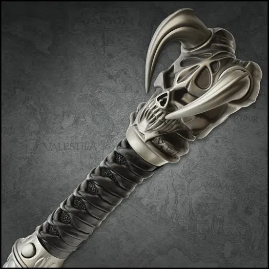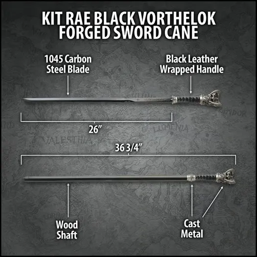 The Kit Rae Black Vorthelok Forged Sword Cane seamlessly blends dark fantasy with exceptional craftsmanship. The 26" high carbon steel blade features a sleek gun-blued finish, offering both visual appeal and durability. Engraved with Anglecal runes, the blade introduces a mystical element, making this sword cane a true work of art. The black leather-wrapped handle ensures a comfortable and secure grip, while the hidden button mechanism provides quick access to the blade, enhancing its practicality. Built to endure, the Vorthelok Forged Sword Cane boasts a sturdy wooden shaft with cast metal fittings, ensuring both strength and durability. Ideal for display or as a statement accessory, this sword cane showcases Kit Rae’s signature fantasy design, offering a unique combination of elegance and functionality. STUNNING DESIGN: Features a 26" high carbon steel blade with a sleek gun-blued finish, combining style and durability. DETAILED ETCHINGS: Engraved with Anglecal runes, adding a touch of magic and mystique. COMFORTABLE HANDLE: Black leather wrap ensures a secure and comfortable grip for easy handling. QUICK RELEASE: The hidden button mechanism enables fast blade access when needed. ROBUST BUILD: Features a wooden shaft with cast metal fittings, designed for durability and strength.