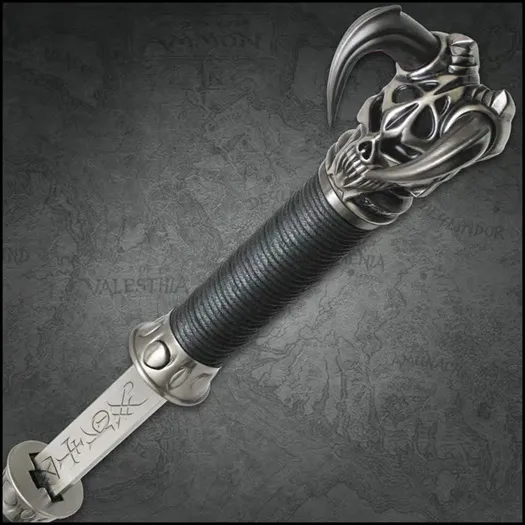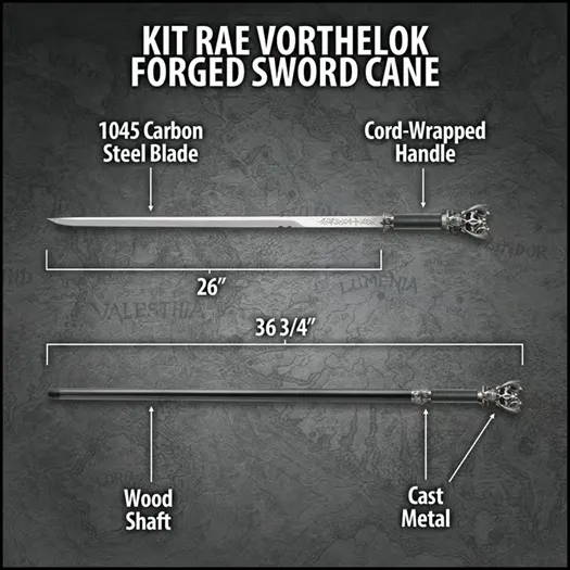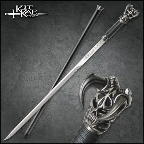 Kit Rae Satin Vorthelok Elegantly Forged Sword Cane. The Kit Rae Vorthelok Forged Sword Cane is a mesmerizing fusion of dark fantasy and expert craftsmanship, embodying Kit Rae’s legendary design aesthetic. Measuring 36 3/4" overall, this sword cane conceals a 26” 1045 carbon steel blade, adorned with intricate engravings that amplify its mystique. The waxed cord-wrapped handle provides a secure, comfortable grip, while the cast metal fittings and horned skull of Evruc give it an unmistakably bold and commanding presence. Designed for display and admiration, the hidden blade locks securely into the wooden shaft and releases effortlessly with a hidden button mechanism. Whether showcased in a collection or carried as a statement piece, the Vorthelok Forged Sword Cane is a striking testament to Kit Rae’s mastery in blending fantasy and craftsmanship into an awe-inspiring work of art. SHARP BLADE: Features a 26” 1045 carbon steel blade with intricate engravings, concealed within the cane. CONVENIENT FUNCTION: The blade locks securely into the wooden shaft and releases with a hidden button. SECURE HANDLING: The waxed cord-wrapped handle provides a comfortable and reliable grip. STRIKING AESTHETICS: Features cast metal fittings and the horned skull of Evruc for a bold, legendary look. GREAT SIZE: With a 36 3/4” overall length, this sword cane offers perfect balance and an imposing presence.