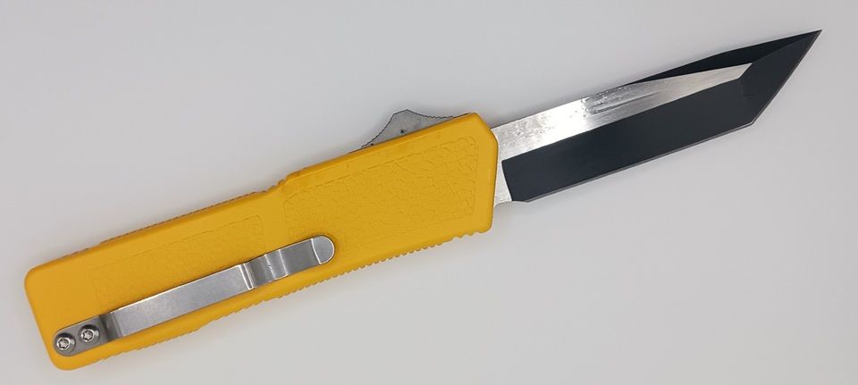 Lightning Supreme Banana Yellow D/A OTF Automatic Knife Tanto Two Tone. The Banana Yellow Lightning Supreme has an 8 inch total length with a 3.25 inch blade. It is a double action in and out switchblade knife. This is a taiwan version. The taiwan version was the first produced before the chinese versions came out. This version has aircraft aluminum handles and better made metal blades. The springs in these are made better than the chinese versions. It comes with a pocket clip which can be taken off.