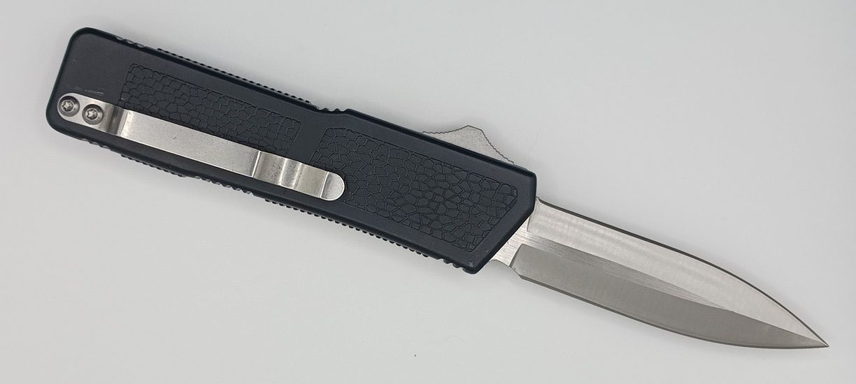 Lightning Supreme Black D/A OTF Automatic Knife Dagger Point Satin Plain. The Black Lightning Supreme has an 8 inch total length with a 3.25 inch blade. It is a double action in and out switchblade knife. This is a taiwan version. The taiwan version was the first produced before the chinese versions came out. This version has aircraft aluminum handles and better made metal blades. The springs in these are made better than the chinese versions. It comes with a pocket clip which can be taken off.