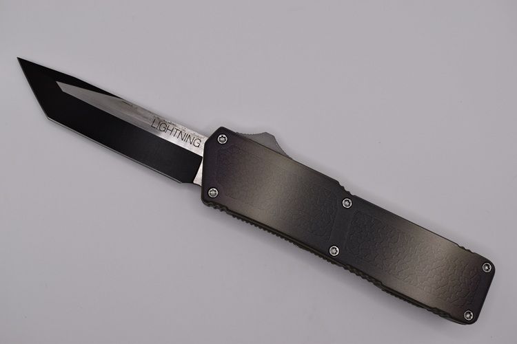 Lightning Supreme Camouflage D/A OTF Automatic Knife Tanto Point Two Tone. The Camouflage Lightning Supreme has an 8 inch total length with a 3.25 inch blade. It is a double action in and out switchblade knife. This is a taiwan version. The taiwan version was the first produced before the chinese versions came out. This version has aircraft aluminum handles and better made metal blades. The springs in these are made better than the chinese versions. It comes with a pocket clip which can be taken off.