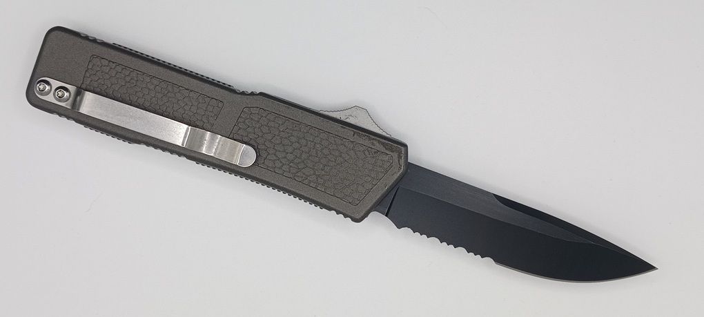 Lightning Supreme Gray D/A OTF Automatic Knife Drop Point Black Serrated. The Gray Lightning Supreme has an 8 inch total length with a 3.25 inch blade. It is a double action in and out switchblade knife. This is a taiwan version. The taiwan version was the first produced before the chinese versions came out. This version has aircraft aluminum handles and better made metal blades. The springs in these are made better than the chinese versions. It comes with a pocket clip which can be taken off.
