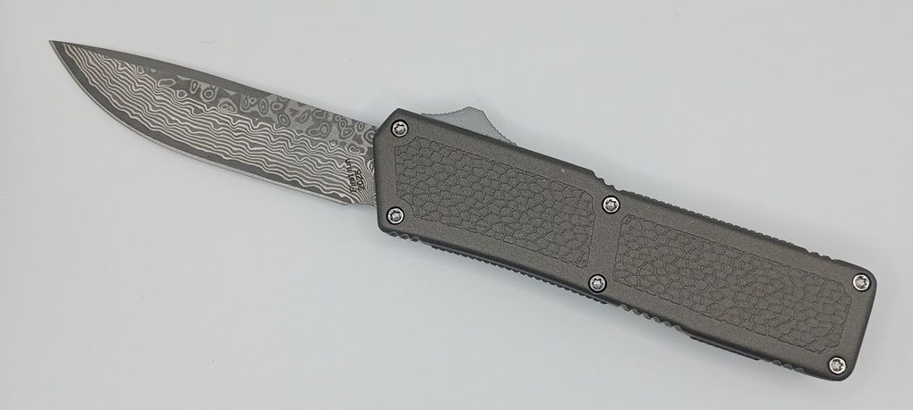Lightning Supreme Gray D/A OTF Automatic Knife Drop Point Damascus Plain. The Gray Lightning Supreme has an 8 inch total length with a 3.25 inch blade. It is a double action in and out switchblade knife. This is a taiwan version. The taiwan version was the first produced before the chinese versions came out. This version has aircraft aluminum handles and better made metal blades. The springs in these are made better than the chinese versions. It comes with a pocket clip which can be taken off.
