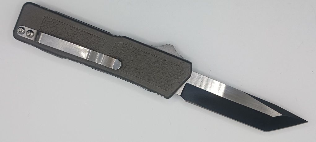 Lightning Supreme Gray D/A OTF Automatic Knife Tanto Point Two Tone Plain. The Gray Lightning Supreme has an 8 inch total length with a 3.25 inch blade. It is a double action in and out switchblade knife. This is a taiwan version. The taiwan version was the first produced before the chinese versions came out. This version has aircraft aluminum handles and better made metal blades. The springs in these are made better than the chinese versions. It comes with a pocket clip which can be taken off.