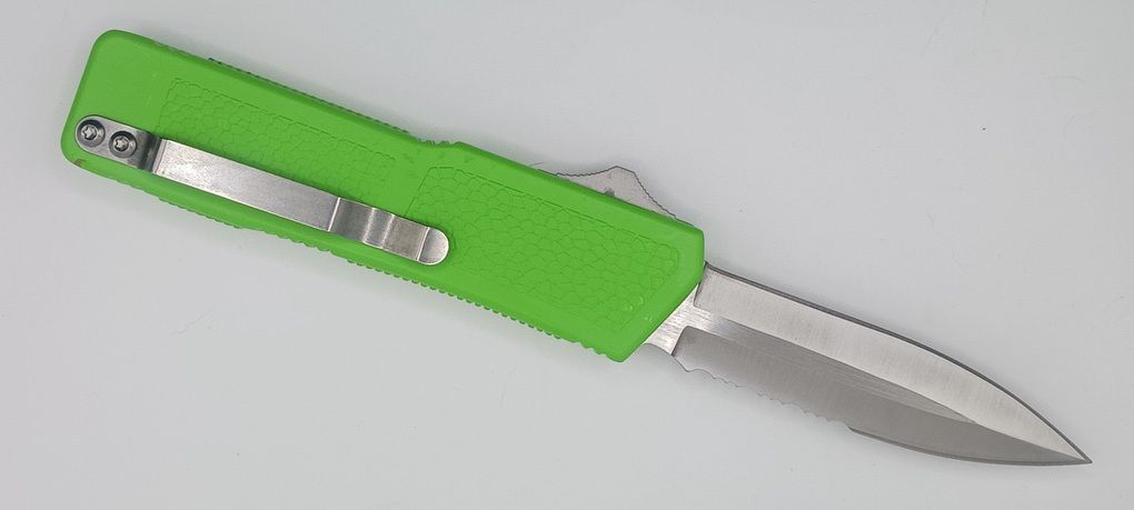 Lightning Supreme Green D/A OTF Automatic Knife Dagger Point Satin Serrated. The Green Lightning Supreme has an 8 inch total length with a 3.25 inch blade. It is a double action in and out switchblade knife. This is a taiwan version. The taiwan version was the first produced before the chinese versions came out. This version has aircraft aluminum handles and better made metal blades. The springs in these are made better than the chinese versions. It comes with a pocket clip which can be taken off.