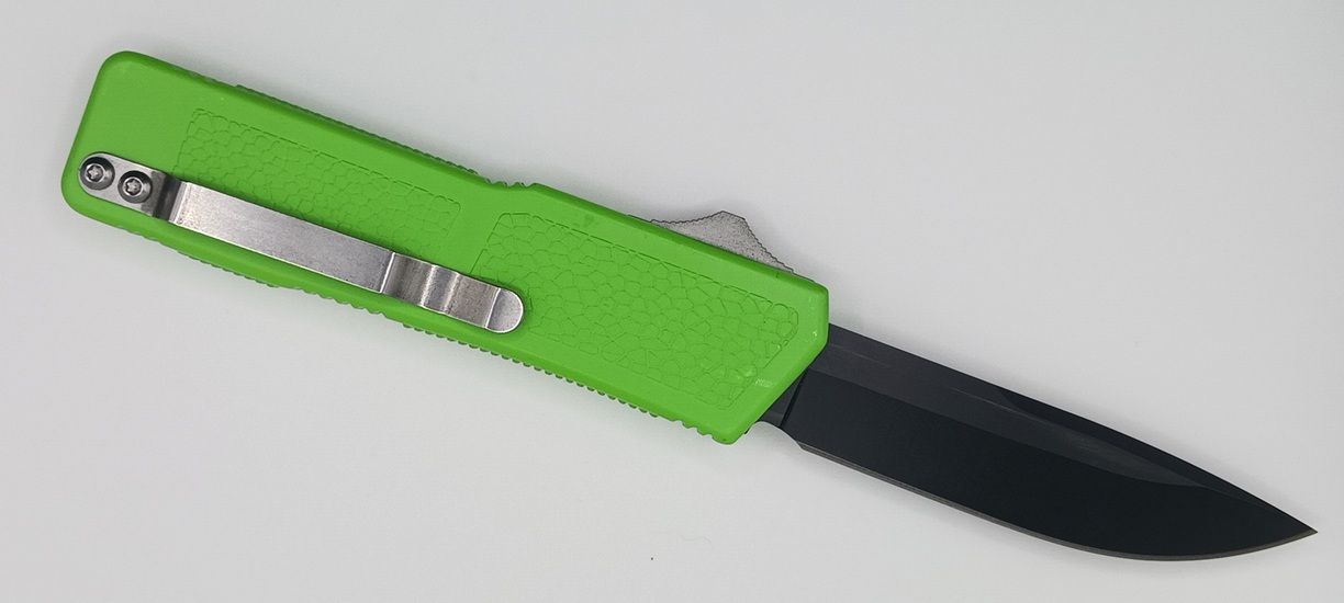 Lightning Supreme Green D/A OTF Automatic Knife Drop Point Black Plain. The Green Lightning Supreme has an 8 inch total length with a 3.25 inch blade. It is a double action in and out switchblade knife. This is a taiwan version. The taiwan version was the first produced before the chinese versions came out. This version has aircraft aluminum handles and better made metal blades. The springs in these are made better than the chinese versions. It comes with a pocket clip which can be taken off.