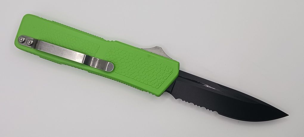 Lightning Supreme Green D/A OTF Automatic Knife Drop Point Black Serrated. The Green Lightning Supreme has an 8 inch total length with a 3.25 inch blade. It is a double action in and out switchblade knife. This is a taiwan version. The taiwan version was the first produced before the chinese versions came out. This version has aircraft aluminum handles and better made metal blades. The springs in these are made better than the chinese versions. It comes with a pocket clip which can be taken off.