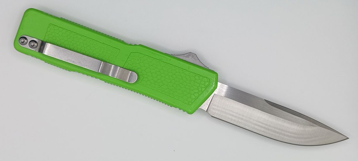 Lightning Supreme Green D/A OTF Automatic Knife Drop Point Satin Plain. The Green Lightning Supreme has an 8 inch total length with a 3.25 inch blade. It is a double action in and out switchblade knife. This is a taiwan version. The taiwan version was the first produced before the chinese versions came out. This version has aircraft aluminum handles and better made metal blades. The springs in these are made better than the chinese versions. It comes with a pocket clip which can be taken off.