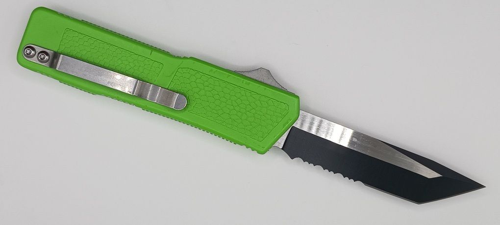 Lightning Supreme Green D/A OTF Automatic Knife Tanto Point Two Tone Serrated. The Green Lightning Supreme has an 8 inch total length with a 3.25 inch blade. It is a double action in and out switchblade knife. This is a taiwan version. The taiwan version was the first produced before the chinese versions came out. This version has aircraft aluminum handles and better made metal blades. The springs in these are made better than the chinese versions. It comes with a pocket clip which can be taken off.