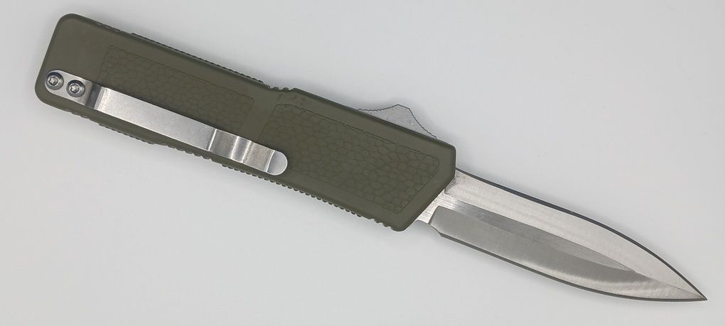 Lightning Supreme OD Green D/A OTF Automatic Knife Dagger Point Satin Plain. The OD Green Lightning Supreme has an 8 inch total length with a 3.25 inch blade. It is a double action in and out switchblade knife. This is a taiwan version. The taiwan version was the first produced before the chinese versions came out. This version has aircraft aluminum handles and better made metal blades. The springs in these are made better than the chinese versions. It comes with a pocket clip which can be taken off.