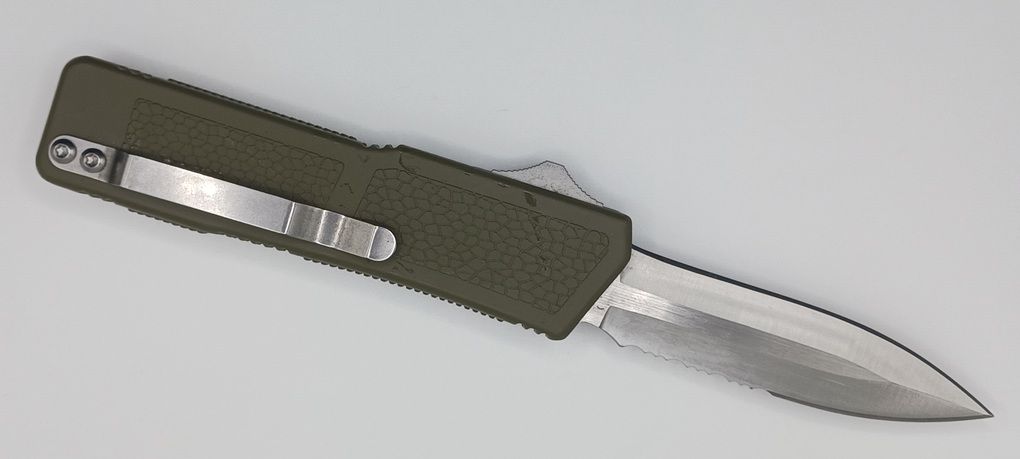 Lightning Supreme OD Green D/A OTF Automatic Knife Dagger Point Satin Serrated. The OD Green Lightning Supreme has an 8 inch total length with a 3.25 inch blade. It is a double action in and out switchblade knife. This is a taiwan version. The taiwan version was the first produced before the chinese versions came out. This version has aircraft aluminum handles and better made metal blades. The springs in these are made better than the chinese versions. It comes with a pocket clip which can be taken off.
