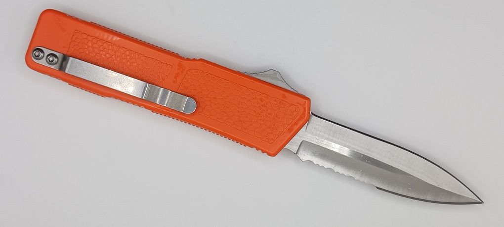 Lightning Supreme Orange D/A OTF Automatic Knife Dagger Point Satin Serrated. The Orange Lightning Supreme has an 8 inch total length with a 3.25 inch blade. It is a double action in and out switchblade knife. This is a taiwan version. The taiwan version was the first produced before the chinese versions came out. This version has aircraft aluminum handles and better made metal blades. The springs in these are made better than the chinese versions. It comes with a pocket clip which can be taken off.
