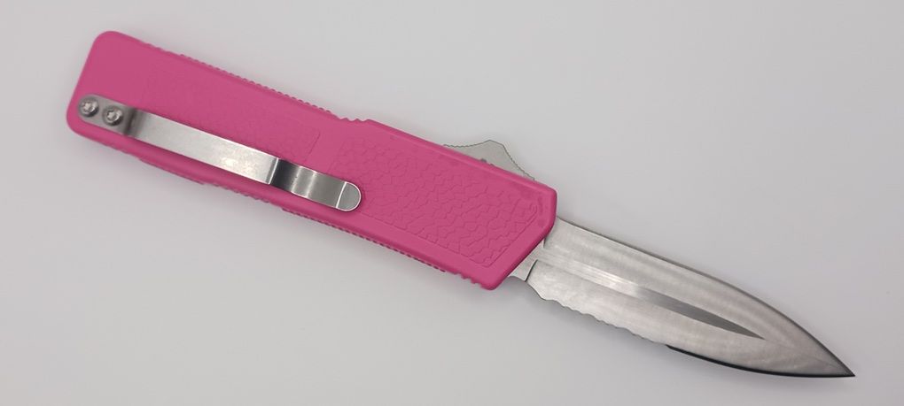 Lightning Supreme Pink D/A OTF Automatic Knife Dagger Point Satin Serrated. The Pink Lightning Supreme has an 8 inch total length with a 3.25 inch blade. It is a double action in and out switchblade knife. This is a taiwan version. The taiwan version was the first produced before the chinese versions came out. This version has aircraft aluminum handles and better made metal blades. The springs in these are made better than the chinese versions. It comes with a pocket clip which can be taken off.