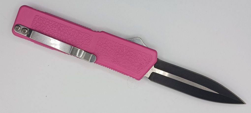 Lightning Supreme Pink D/A OTF Automatic Knife Dagger Point Two Tone Plain. The Pink Lightning Supreme has an 8 inch total length with a 3.25 inch blade. It is a double action in and out switchblade knife. This is a taiwan version. The taiwan version was the first produced before the chinese versions came out. This version has aircraft aluminum handles and better made metal blades. The springs in these are made better than the chinese versions. It comes with a pocket clip which can be taken off.