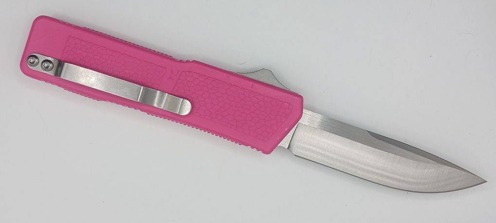Lightning Supreme Pink D/A OTF Automatic Knife Drop Point Satin Plain. The Pink Lightning Supreme has an 8 inch total length with a 3.25 inch blade. It is a double action in and out switchblade knife. This is a taiwan version. The taiwan version was the first produced before the chinese versions came out. This version has aircraft aluminum handles and better made metal blades. The springs in these are made better than the chinese versions. It comes with a pocket clip which can be taken off.