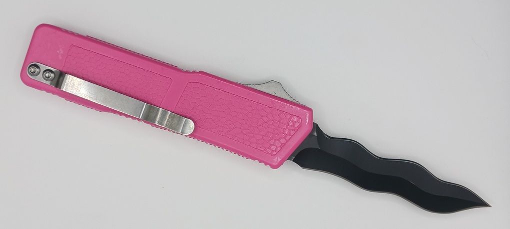 Lightning Supreme Pink D/A OTF Automatic Knife Kris Point Black Plain. The Pink Lightning Supreme has an 8 inch total length with a 3.25 inch blade. It is a double action in and out switchblade knife. This is a taiwan version. The taiwan version was the first produced before the chinese versions came out. This version has aircraft aluminum handles and better made metal blades. The springs in these are made better than the chinese versions. It comes with a pocket clip which can be taken off.