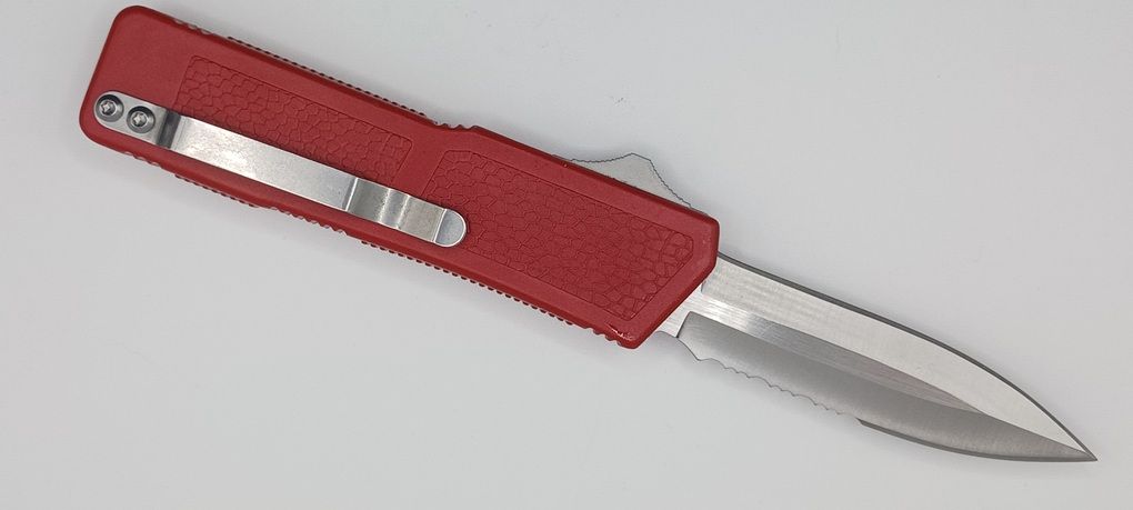 Lightning Supreme Red D/A OTF Automatic Knife Dagger Point Satin Serrated. The Red Lightning Supreme has an 8 inch total length with a 3.25 inch blade. It is a double action in and out switchblade knife. This is a taiwan version. The taiwan version was the first produced before the chinese versions came out. This version has aircraft aluminum handles and better made metal blades. The springs in these are made better than the chinese versions. It comes with a pocket clip which can be taken off.