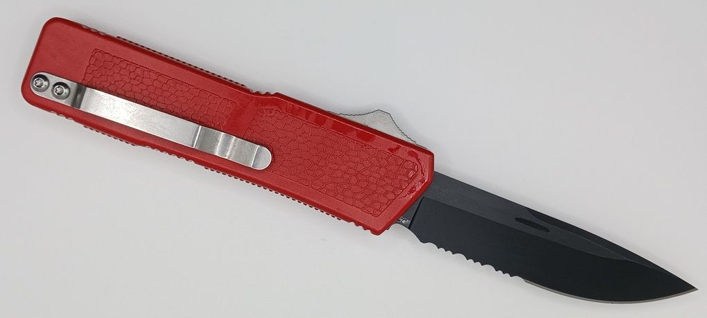 Lightning Supreme Red D/A OTF Automatic Knife Drop Point Black Serrated. The Red Lightning Supreme has an 8 inch total length with a 3.25 inch blade. It is a double action in and out switchblade knife. This is a taiwan version. The taiwan version was the first produced before the chinese versions came out. This version has aircraft aluminum handles and better made metal blades. The springs in these are made better than the chinese versions. It comes with a pocket clip which can be taken off.