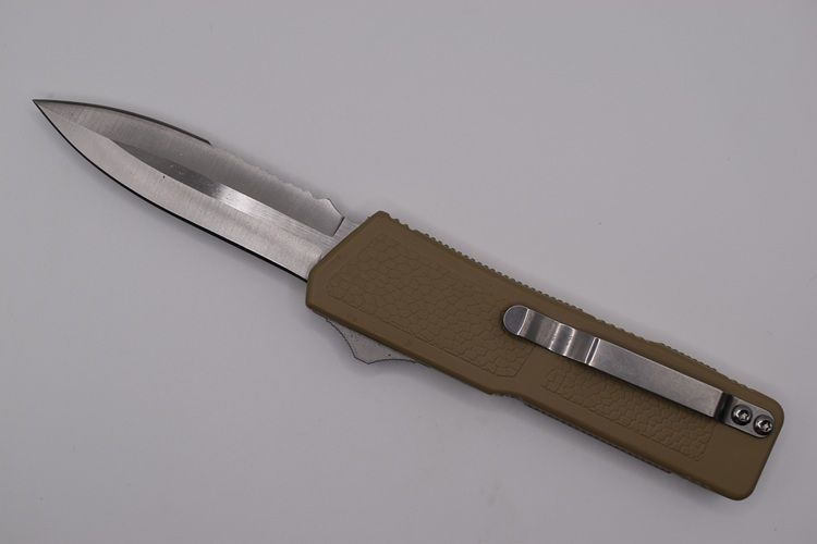 Lightning Supreme Tan D/A OTF Automatic Knife Dagger Point Satin Serrated. The Tan Lightning Supreme has an 8 inch total length with a 3.25 inch blade. It is a double action in and out switchblade knife. This is a taiwan version. The taiwan version was the first produced before the chinese versions came out. This version has aircraft aluminum handles and better made metal blades. The springs in these are made better than the chinese versions. It comes with a pocket clip which can be taken off.