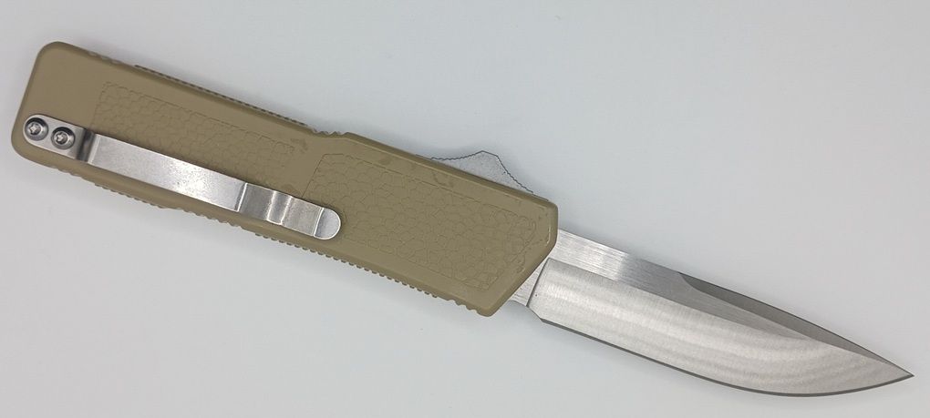 Lightning Supreme Tan D/A OTF Automatic Knife Drop Point Satin Plain. The Tan Lightning Supreme has an 8 inch total length with a 3.25 inch blade. It is a double action in and out switchblade knife. This is a taiwan version. The taiwan version was the first produced before the chinese versions came out. This version has aircraft aluminum handles and better made metal blades. The springs in these are made better than the chinese versions. It comes with a pocket clip which can be taken off.