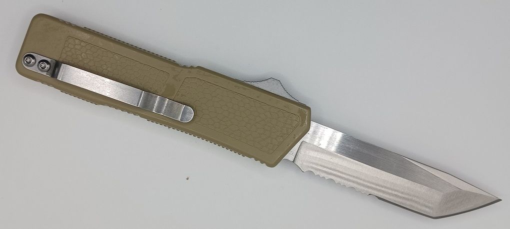 Lightning Supreme Tan D/A OTF Automatic Knife Tanto Point Satin Serrated. The Tan Lightning Supreme has an 8 inch total length with a 3.25 inch blade. It is a double action in and out switchblade knife. This is a taiwan version. The taiwan version was the first produced before the chinese versions came out. This version has aircraft aluminum handles and better made metal blades. The springs in these are made better than the chinese versions. It comes with a pocket clip which can be taken off.
