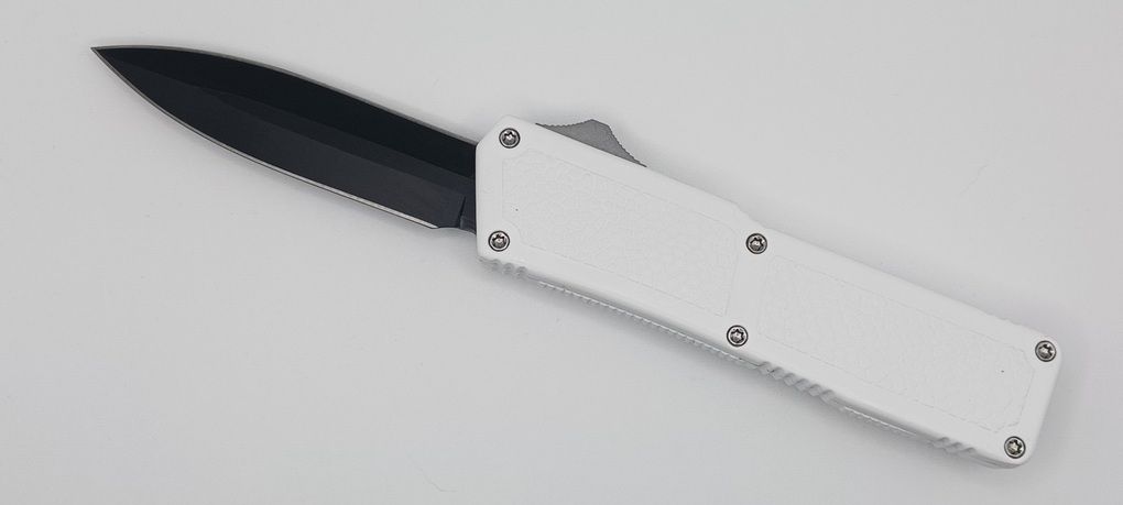 Lightning Supreme White D/A OTF Automatic Knife Dagger Point Black Plain. The White Lightning Supreme has an 8 inch total length with a 3.25 inch blade. It is a double action in and out switchblade knife. This is a taiwan version. The taiwan version was the first produced before the chinese versions came out. This version has aircraft aluminum handles and better made metal blades. The springs in these are made better than the chinese versions. It comes with a pocket clip which can be taken off.