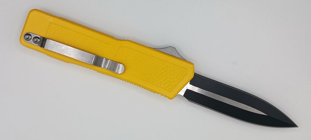 Lightning Supreme Yellow D/A OTF Automatic Knife Dagger Point Two Tone Plain. The Yellow Lightning Supreme has an 8 inch total length with a 3.25 inch blade. It is a double action in and out switchblade knife. This is a taiwan version. The taiwan version was the first produced before the chinese versions came out. This version has aircraft aluminum handles and better made metal blades. The springs in these are made better than the chinese versions. It comes with a pocket clip which can be taken off.
