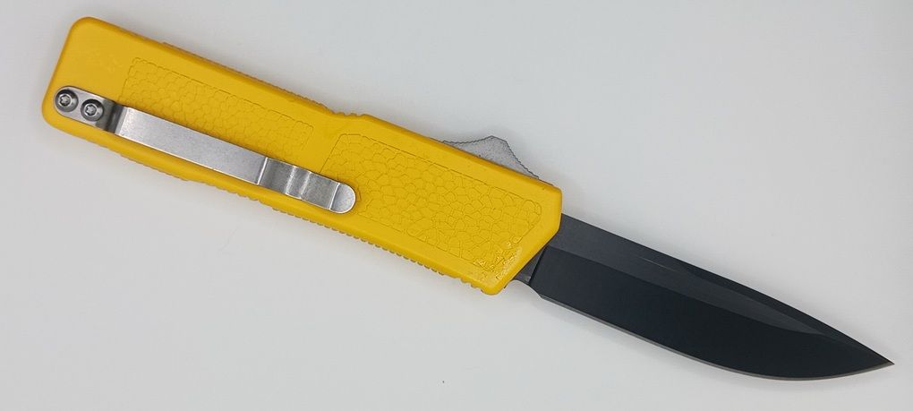 Lightning Supreme Yellow D/A OTF Automatic Knife Drop Point Black Plain. The Yellow Lightning Supreme has an 8 inch total length with a 3.25 inch blade. It is a double action in and out switchblade knife. This is a taiwan version. The taiwan version was the first produced before the chinese versions came out. This version has aircraft aluminum handles and better made metal blades. The springs in these are made better than the chinese versions. It comes with a pocket clip which can be taken off.