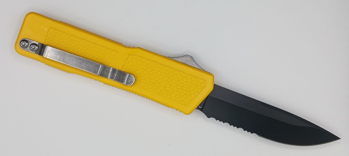Lightning Supreme Yellow D/A OTF Automatic Knife Drop Point Black Serrated. The Yellow Lightning Supreme has an 8 inch total length with a 3.25 inch blade. It is a double action in and out switchblade knife. This is a taiwan version. The taiwan version was the first produced before the chinese versions came out. This version has aircraft aluminum handles and better made metal blades. The springs in these are made better than the chinese versions. It comes with a pocket clip which can be taken off.