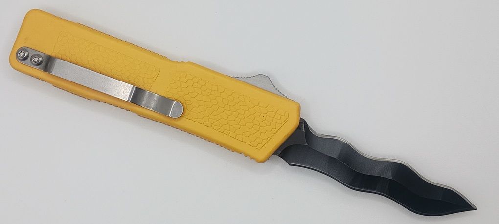 Lightning Supreme Yellow D/A OTF Automatic Knife Kris Point Black Plain. The yellow Lightning Supreme has an 8 inch total length with a 3.25 inch blade. It is a double action in and out switchblade knife. This is a taiwan version. The taiwan version was the first produced before the chinese versions came out. This version has aircraft aluminum handles and better made metal blades. The springs in these are made better and stronger than the chinese versions. It comes with a pocket clip which can be taken off.