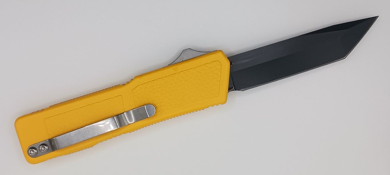 Lightning Supreme Yellow D/A OTF Automatic Knife Tanto Point Black Plain. The Yellow Lightning Supreme has an 8 inch total length with a 3.25 inch blade. It is a double action in and out switchblade knife. This is a taiwan version. The taiwan version was the first produced before the chinese versions came out. This version has aircraft aluminum handles and better made metal blades. The springs in these are made better than the chinese versions. It comes with a pocket clip which can be taken off.