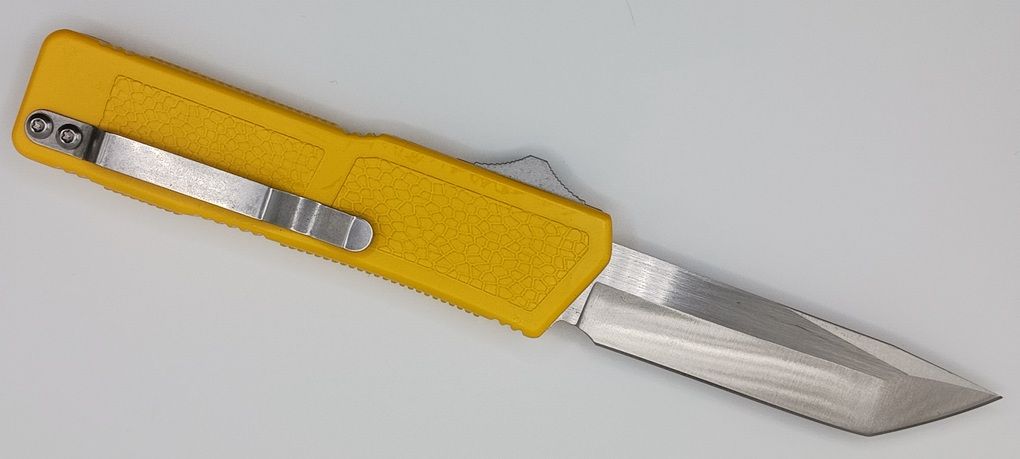 Lightning Supreme Yellow D/A OTF Automatic Knife Tanto Point Satin Plain. The Yellow Lightning Supreme has an 8 inch total length with a 3.25 inch blade. It is a double action in and out switchblade knife. This is a taiwan version. The taiwan version was the first produced before the chinese versions came out. This version has aircraft aluminum handles and better made metal blades. The springs in these are made better than the chinese versions. It comes with a pocket clip which can be taken off.
