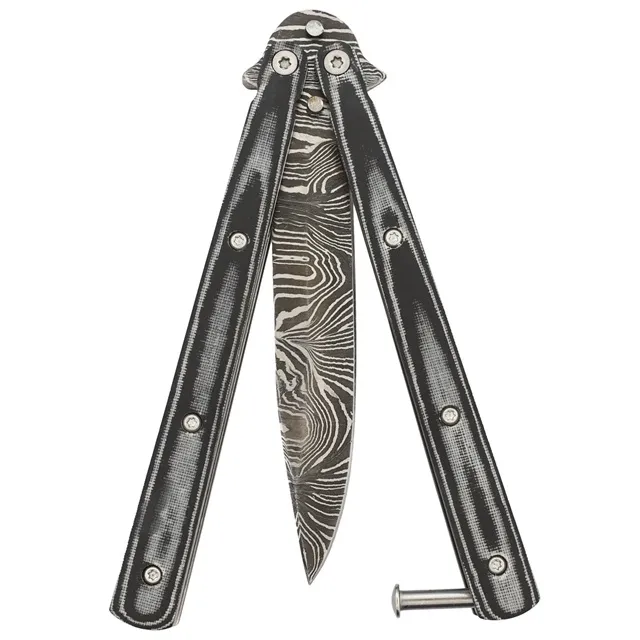 Micarta Black Damascus Steel Drop Point Heavy Duty Butterfly Knife. Sporting a Damascus steel drop point blade, the slim build and good weight of this balisong butterfly knife delivers nice action in an attractive package. The distinctive Micarta construction handle is decorated with an attractive black and grey wooden pattern which is attached to the steel inner framing with a torque screw. A metal safety latch is included to lock the blade into place when it is not in use as well as when it is deployed. The blade offers blood grooves on both sides allowing for a more balanced blade. Also known as a balisong, a butterfly knife or fan knife is a folding pocket knife with two handles counter rotating around the tang such that, when closed, the blade is concealed within grooves in the handles. Butterfly knives are especially useful in situations where it is inconvenient to use both hands to open a knife. Please make sure to check your local laws regarding the procession and import of these knives. Overall Length: 9 Inches, Blade Length: 4 Inches