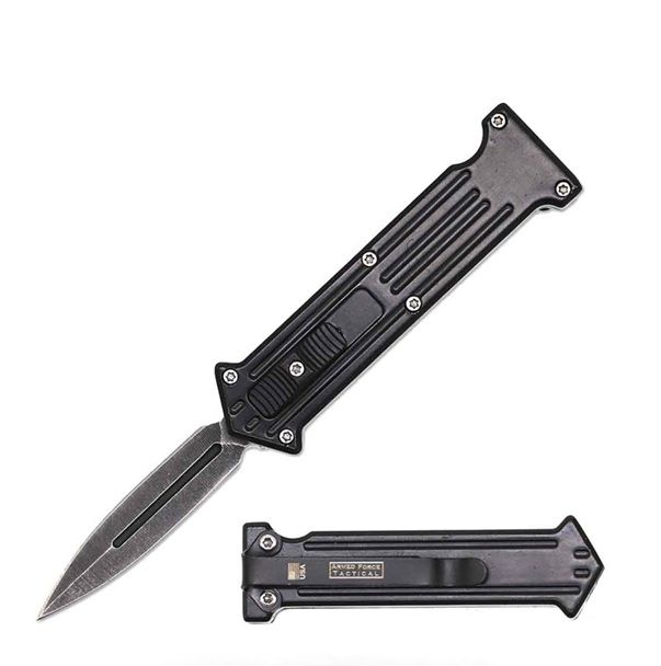 Mini Joker 5" OTF Automatic Knife. California legal With a compact closed length of 3" and an overall length of 5", stainless steel dagger blade. black zinc alloy handle features a pocket clip.