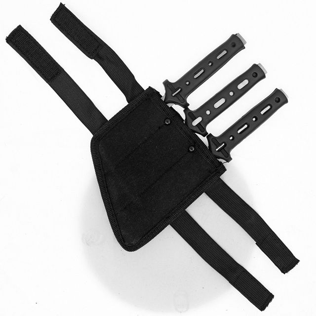 Modern Ninja Trinity Boot Knife Set 3 Piece Full Tang Throwers with Rubber Grip and Sheath. Compact and balanced, this set includes two 7.1 inches knives and one 4.8 inches knife. Crafted from heat-treated 440 stainless steel with double-edged blades and partial serrations. Non-slip rubber grips and a tactical nylon boot sheath complete the set. Specifications: Knife lengths: two at 7.1 inches; one at 4.8 inches Blade lengths: 3.75 inches (×2), 2.5 inches & 2.9 mm thick, heat-treated 440 stainless steel, double-edged, partial serrations, full tang Handle: 3.75 inches black slotted rubber grip Overall length in sheath: 8 inches Pommel: Exposed tang Accessories: Black ballistic nylon sheath with belt loop & wrap-around straps Features: 3-piece set with different blade lengths for versatility Sharp double-edged stainless steel blades Partial serrations for added cutting ability Non-slip rubber grips and full tang construction Includes boot sheath for discreet carry
