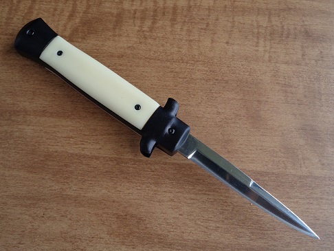 Old School 9" Imitation Ivory Stiletto D/A OTF Automatic Knife Satin Bayo. Overall Length:9.00" Blade Length:3.75" Stainless Steel Satin Dagger. Comes with a belt sheath. Dual action in and out with the push of a button. Very strong spring action and construction without any misfires.