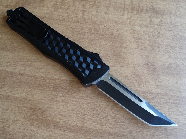 Q-Bert Black D/A OTF Automatic Knife Two Tone Tanto. Blade Material 440 Stainless Steel Blade Type Serrated double action Out the Front Handle Construction Stainless Steel Features Belt Clip, Glass Breaker, and Nylon Carrying Case Blade Length 3.5" Handle Length 5.5" Overall Length 9"